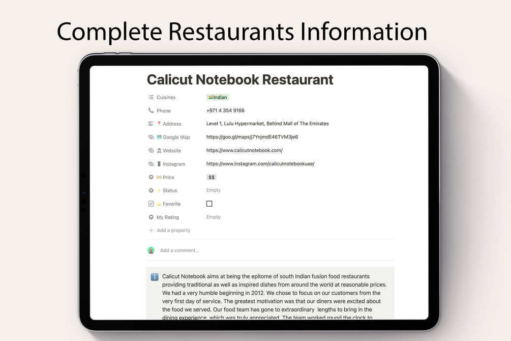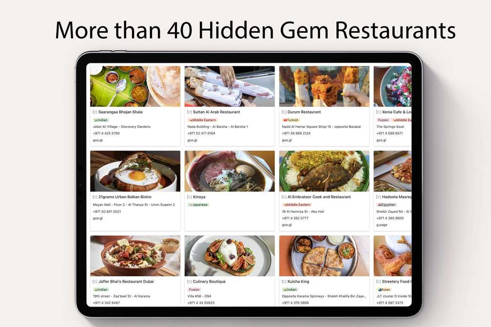 Eat Like a Dubai Local is the collection of 40 hidden gem restaurants in Dubai. There is a wide range of collections of restaurants from different countries such as Nepal, India, Iraq, Pakistan, and many more. This template was designed on Notion with ❤️ in San Francisco by a Professional Eater who has lived in Dubai for 17 years.